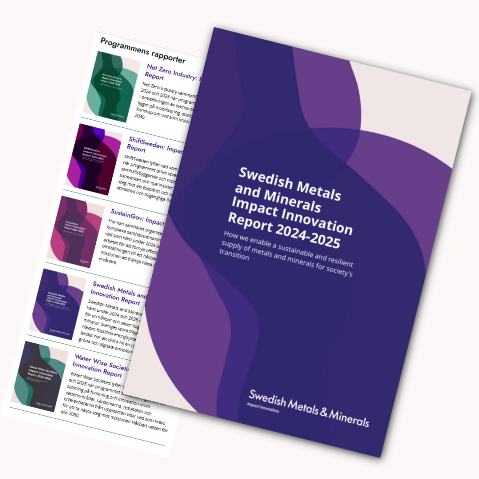 Swedish Metals & Minerals is one of five programs within Impact Innovation – Sweden's large innovation initiative to tackle the challenges of our time and the future. Impact Innovation is initiated by the Swedish Energy Agency, Formas, Vinnova and the industry.
