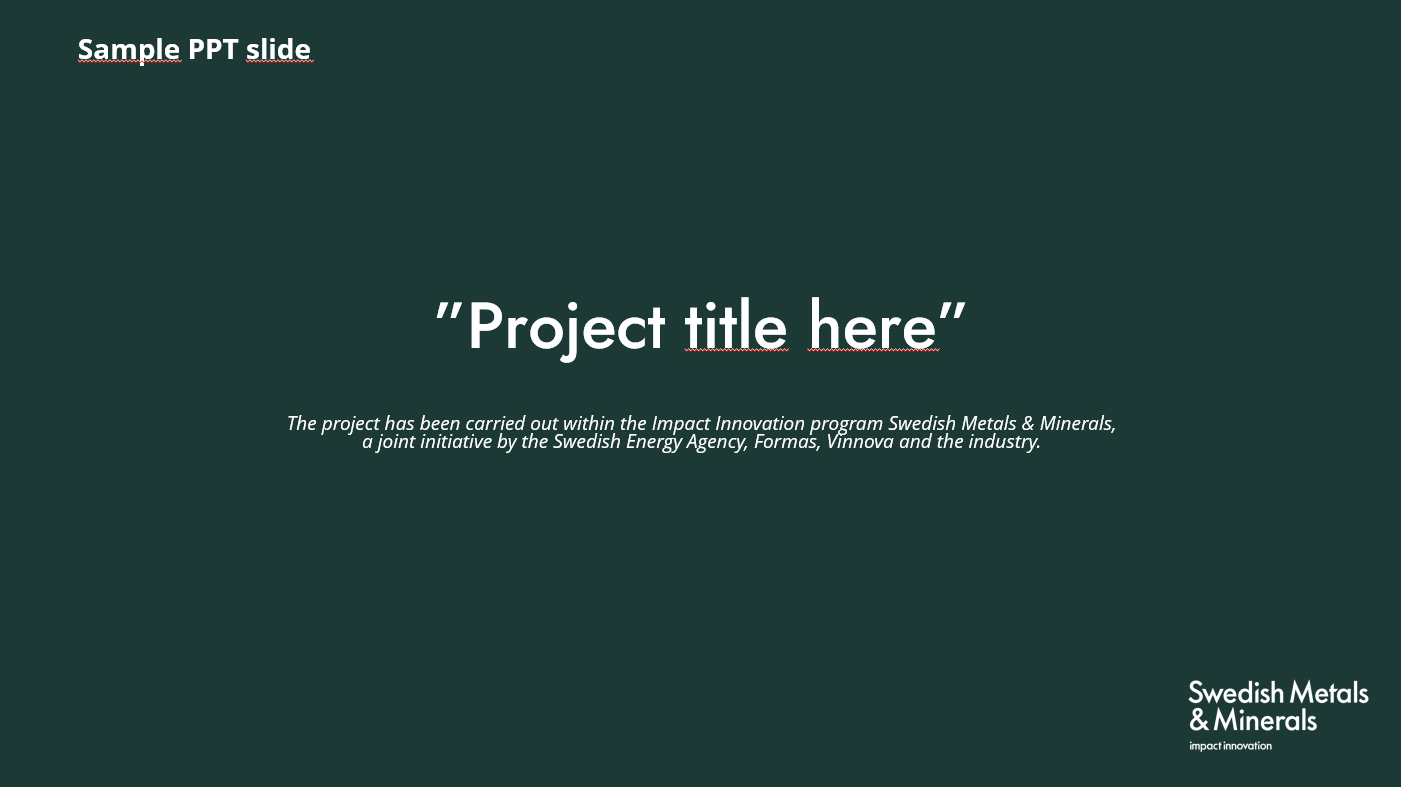 When communicating the project and publishing project results, it must be stated that: the work was carried out within the Impact Innovation program Swedish Metals & Minerals, a joint initiative by the Swedish Energy Agency, Formas, Vinnova and the industry.